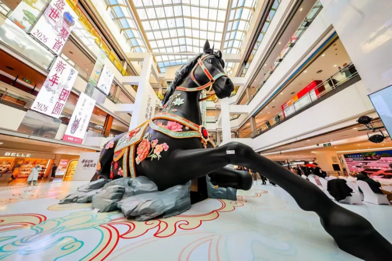 Центральное место в экспозиции заняла шестнадцатиметровая инсталляция «Гигантский конь». Арт-объект высотой в три этажа создан по мотивам бронзовой головы коня из коллекции Юаньминъюань и передает величественный дух эпохи Цин, запечатленный на картине «Император Цяньлун в церемониальных доспехах на коне». Эта работа стала творческим подарком к наступающему 2026 году, который пройдет под знаком Лошади.