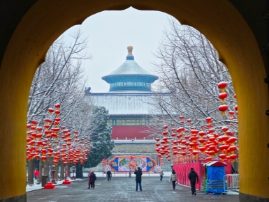 Храм Неба в снегу: удивительная весенняя панорама древней столицы