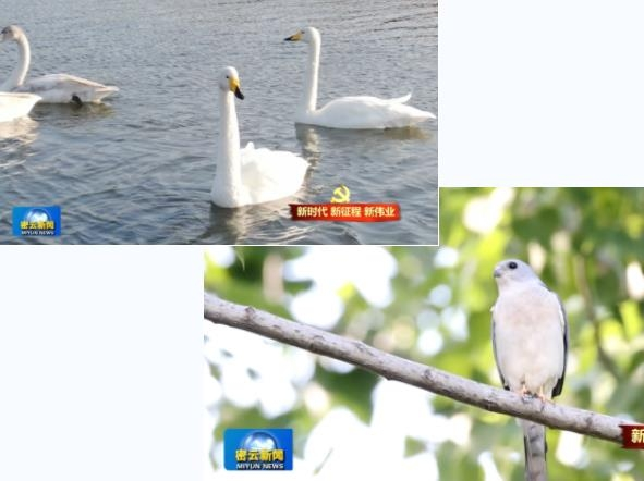 С середины ноября 2022 года в районе Миюнь слетелось более десятка белых лебедей. Вокруг водохранилища и в верхнем течении реки зафиксированы десятки редких птиц, таких как гуменники и серые цапли. Будучи наглядным показателем качества экологии, популяция перелетных птиц в районе растет с каждым годом, а расширяется и видовое разнообразие, что стало свидетельством благоприятной окружающей среды в районе Миюнь. В настоящее время в районе Миюнь в естественной среде обитает 472 вида животных и птиц.