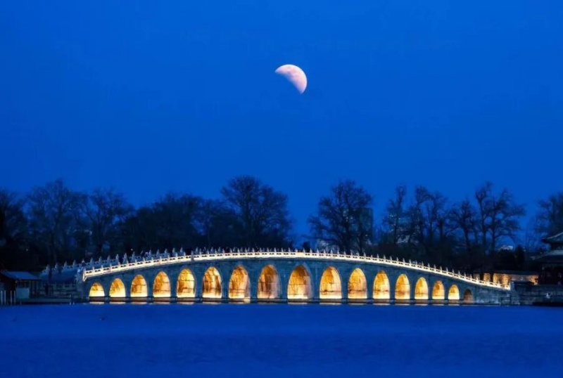 Арочный мост Шицикунцяо («Мост из 17 пролетов») и красная луна.